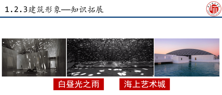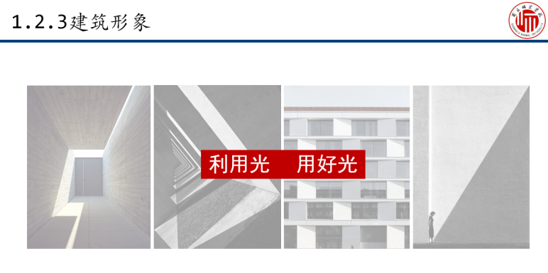 通过互动思考,引出建筑形象的表现手法,逐一对影响建筑形象的空间和形态、色彩及光影的知识内容进行讲授和阐释。通过教师讲授让学生掌握空间及形态的关系、材质质感的类型以及光影在建筑中的应用。通过建筑大师对“光”的理解的几句话和建筑作品中对“光”的运用启发学生以后课程设计中使用光、用好光。