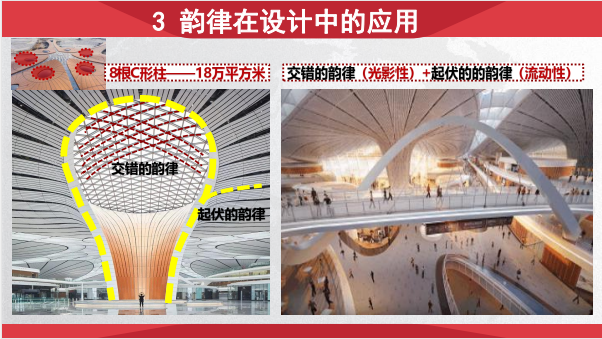 第三步:案例探究——大兴国际机场(思政点3:现代建筑)。大兴机场被誉为“世界第七大奇迹”,仅仅用了4年时间建成,而且还创造了6项世界第一:世界规模最大的单体机场航站楼;世界最大的采用隔震支座的机场航站楼;世界最大的无结构缝一体化航站楼;它不仅仅随处的“黑科技”,还将成为世界上最繁忙的艺术馆,韵律之美在现代的设计中可以达到引导空间的作用。